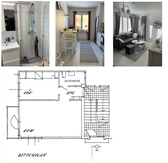 • Beskrivning: Lägenheten är i mycket fint nyrenoverat skick med vitmålade väggar och grått vinylklickgolv. Köket har integrerad diskmaskin och vita luckor. Kyl/frys och hällspis är i rostfritt. Badrum med kaklad duschhörna och vikbara duschväggar i glas. Bra förvaring i kommod och spegelskåp. Balkong finns med utgång från vardagsrummet. Tvättstuga, cykelförråd och lägenhetsförråd finns i källaren. Fastigheten har öppen fiber.
